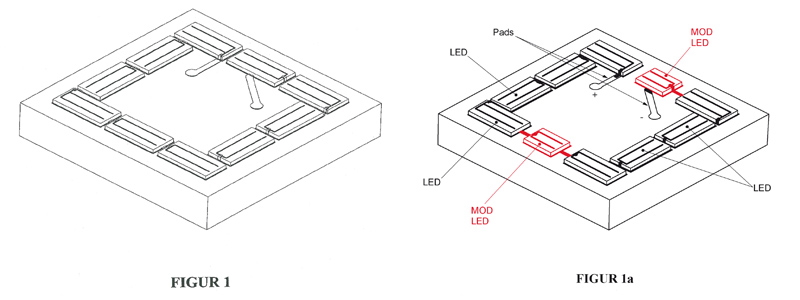 Es könnte z. B. gefragt werden, ob eine quadratische Ausbildung der jeweils mittleren LED in beiden Dreier-Reihen von rechteckigen LEDs noch eine Nachbildung wäre, bei ansonsten gleichem Aufbau der Topografie. Figur 1a zeigt eine solche Abwandlung bildlich, die als mögliche „Nachbildung der Topologie als solche“ eine Frage zum Schutzbereich der angemeldeten Topografie wäre. Widersinnig wäre es doch, wenn eine Veränderung schon der Winkellage der beiden leitfähigen Bondpads (mit „+“ und „–“ gekennzeichnet) um 10° bis 30° auf dem Trägersubstrat aus dem Schutz der angemeldeten Topografie als solcher führen würde. Die quadratische Ausbildung der jeweils mittleren LED hingegen würde aus der Nachbildung der angemeldeten „Topologie als solche“ führen (siehe Figur 1a).
