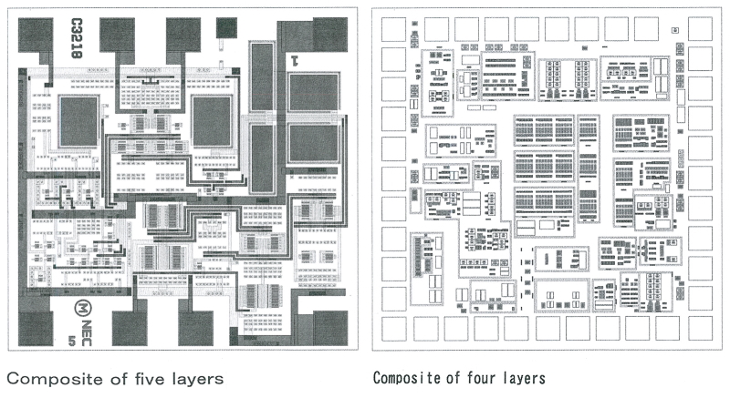 Ein Beispiel einer Topografie ist ein Verstärkerchip (5 V, automatische Verstärkungsregelung AGC), der fünf Lagen aufweist, die aber nicht zu erkennen sind. Der Hersteller ist auf der Topografie angegeben. Diese Topografie war beim DPMA unter DE 202 75 032.9 eingetragen.