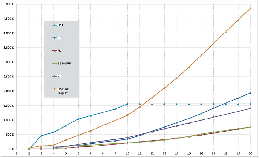 Die Grafik macht den steileren Anstieg ab Jahr 10 deutlich. Verglichen mit den Jahresgebühren des EPA (vor der Erteilung) ist erst das zwölfte UP-Jahr teurer als die Jahresgebühr für die nicht erteilte EP-Anmeldung. Wird das europäische Patent im Jahr 7 erteilt, fällt die Jahresgebühr für das achte UP-Jahr von EUR 1.155 (EP – 7. Jahr) auf EUR 815 (UP – 8. Jahr). Ab dem zwölften Jahr ist der Sprung der nächsten Jahresgebühr ein Aufwärtssprung, z. B. von EUR 1.560 (EP) im elften Jahr auf EUR 1.775 (UP) für das zwölfte Jahr.
